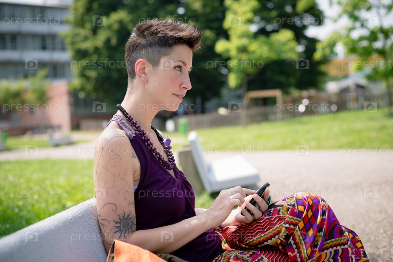 Красивая женщина-хипстер с короткой стрижкой в парке