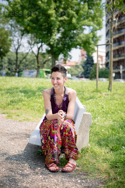 Красивая женщина-хиппи с короткой стрижкой в паркеп