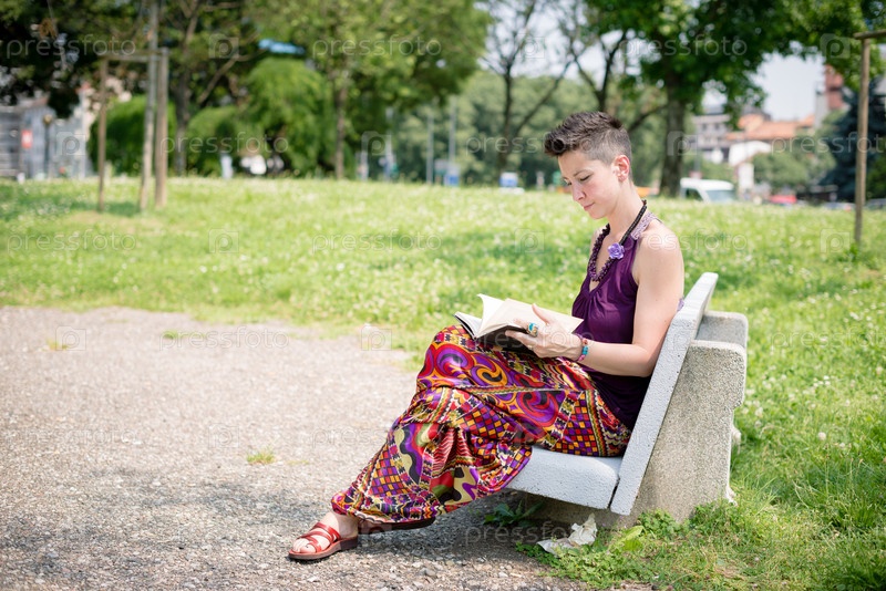 Красивая женщина-хиппи с короткой стрижкой в парке