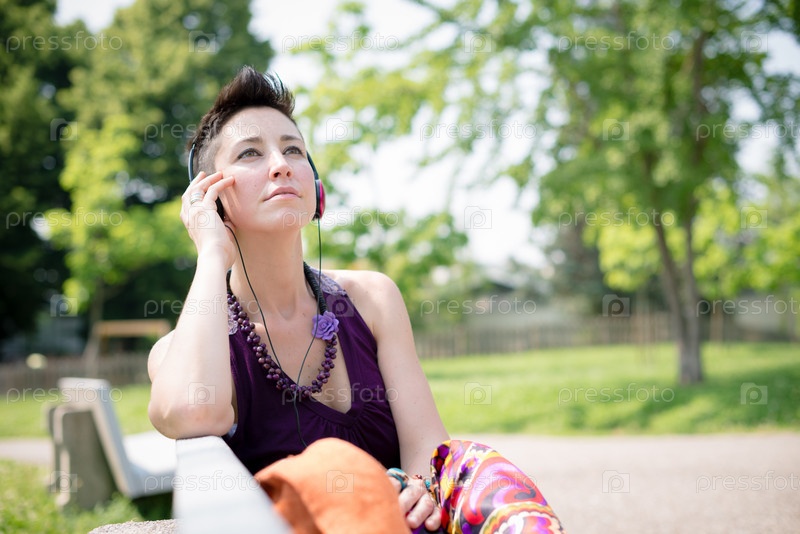 Красивая женщина-хипстер с короткой стрижкой слушает музыку в парке