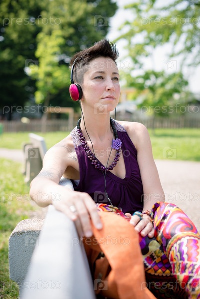 Красивая женщина-хипстер с короткой стрижкой слушает музыку в парке