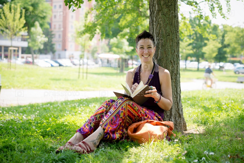 Красивая женщина-хипстер с короткой стрижкой читает книгу в парке