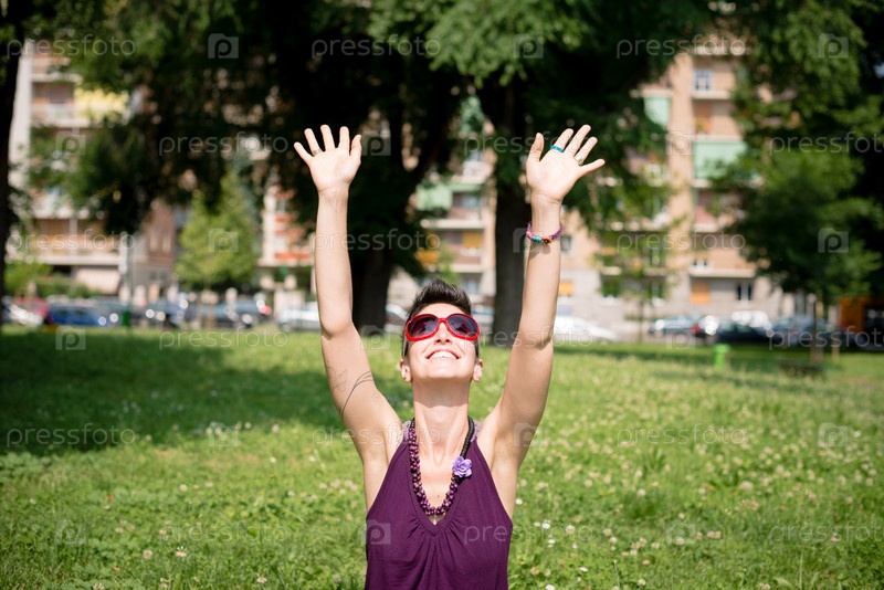 Красивая женщина-хипстер с короткой стрижкой в парке