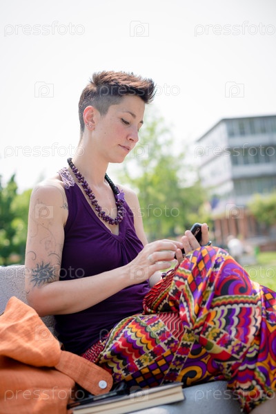 Красивая женщина-хипстер с короткой стрижкой в парке
