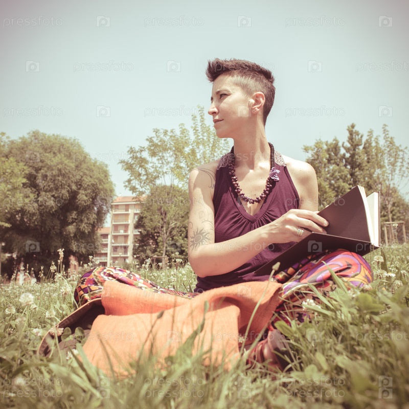 Красивая женщина-хипстер с короткой стрижкой читает книгу в парке