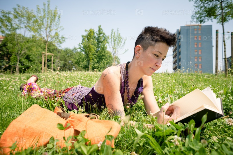 Красивая женщина-хипстер с короткой стрижкой читает книгу в парке