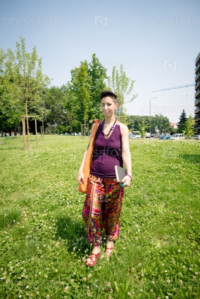 Красивая женщина-хипстер с короткой стрижкой в парке