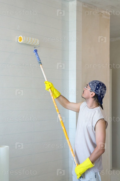 Молодой человек красит обои