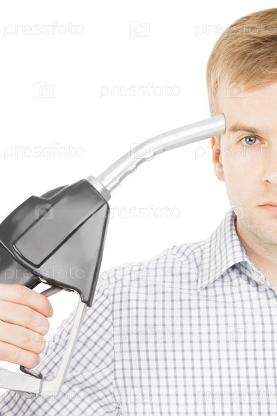 Мужчина указывает на свою голову черным топливным насосом