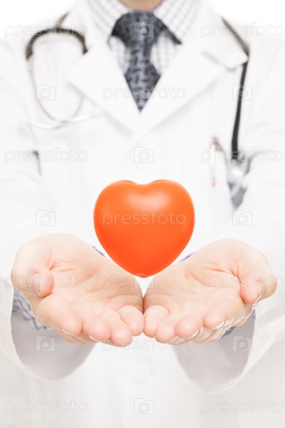 Доктор с игрушечным сердцем на ладони на белом фоне