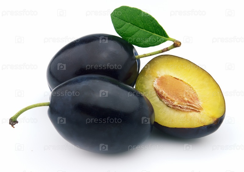 Спелые сливы с листком на белом фоне