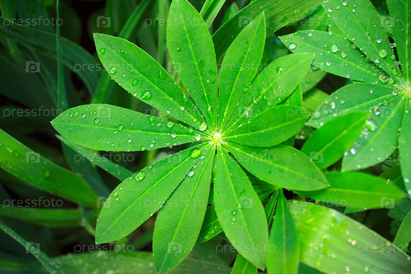Капли дождя на зеленых листьях