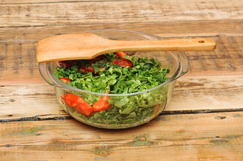 Здоровый вегетарианский салат на деревянном фоне
