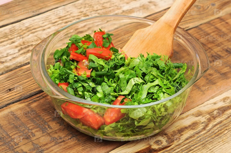 Здоровый вегетарианский салат на деревянном фоне