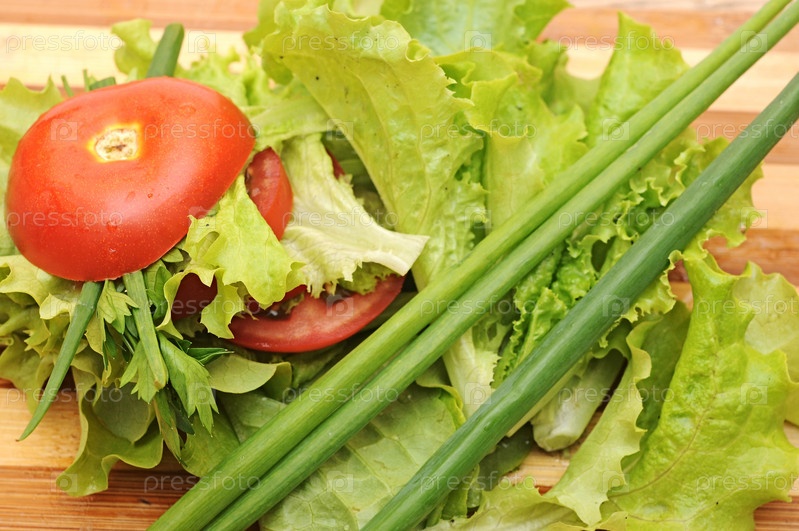 Свежий красный помидор, зеленый лук, салат, петрушка на деревянной доске