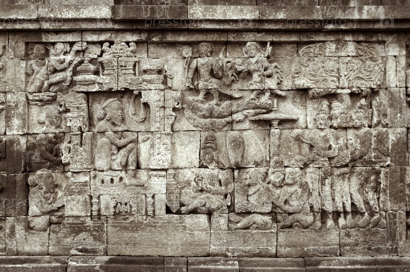 Деталь резного рельефа на Боробудуре на острове Ява, Индонезия