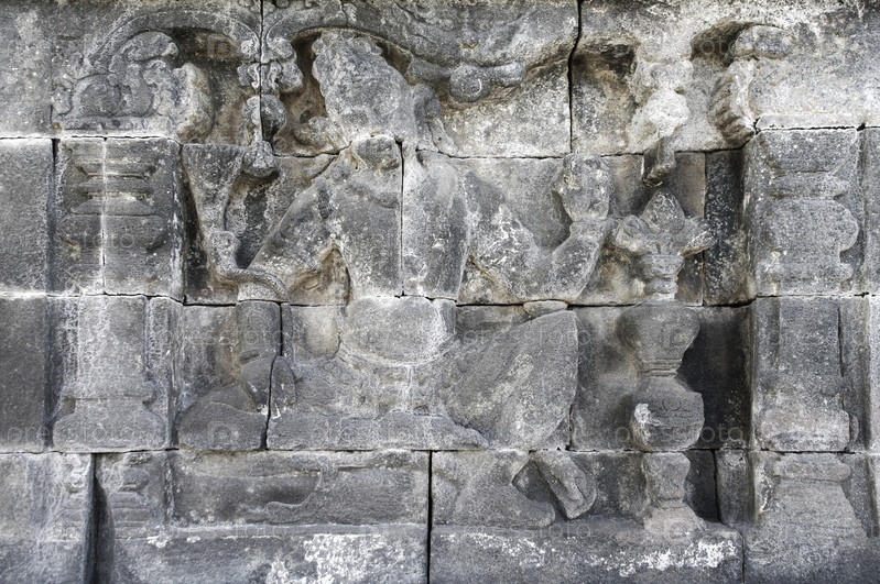 Деталь резного рельефа на Боробудуре на острове Ява, Индонезия