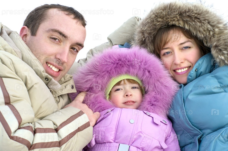 Счастливая молодая семья на улице зимой