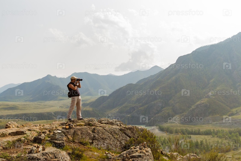 Красивый пейзаж с силуэтом фотографа на фоне гор