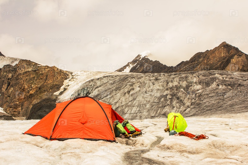 Альпинист отдыхает в палатке на леднике