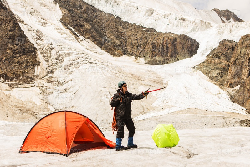 Альпинист стоит возле палатки на леднике