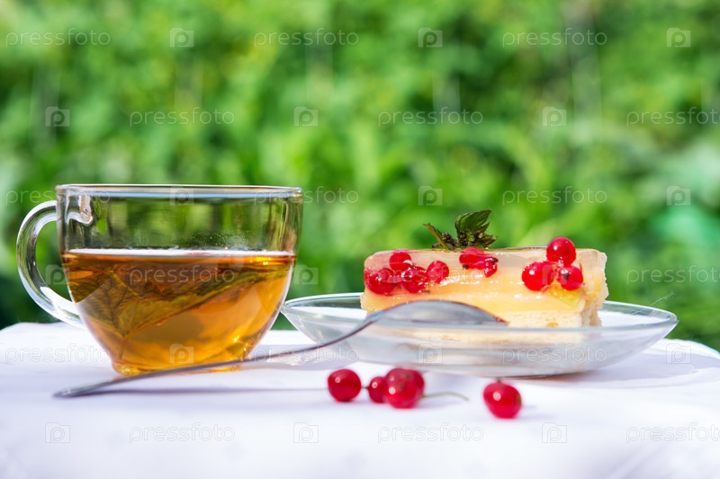 Чай и вкусный кусок торта на белой ткани