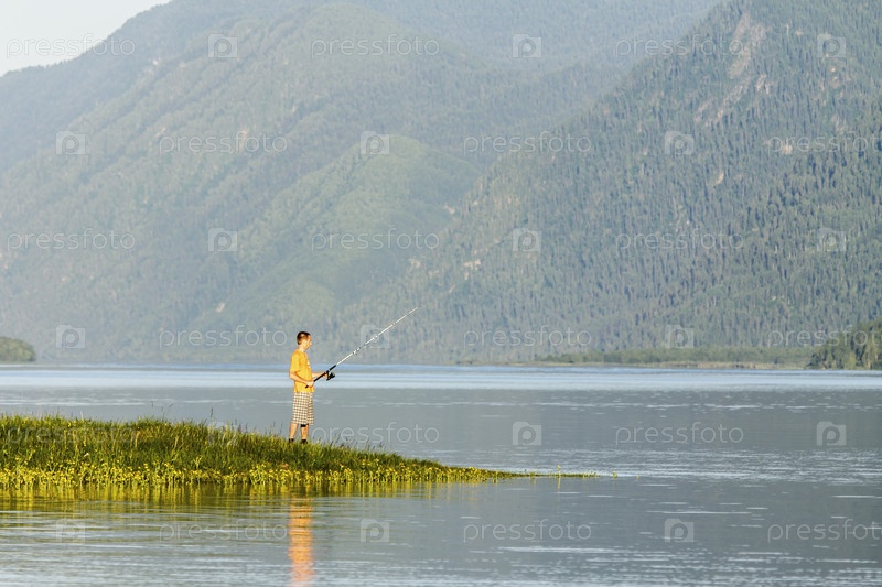 Красивое водохранилище в Сибири и рыбак на берегу