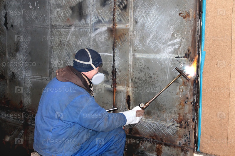 Сварщик с горелкой нагревает металлический лист