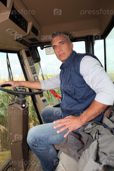 Фермер сидит в кабине комбайна