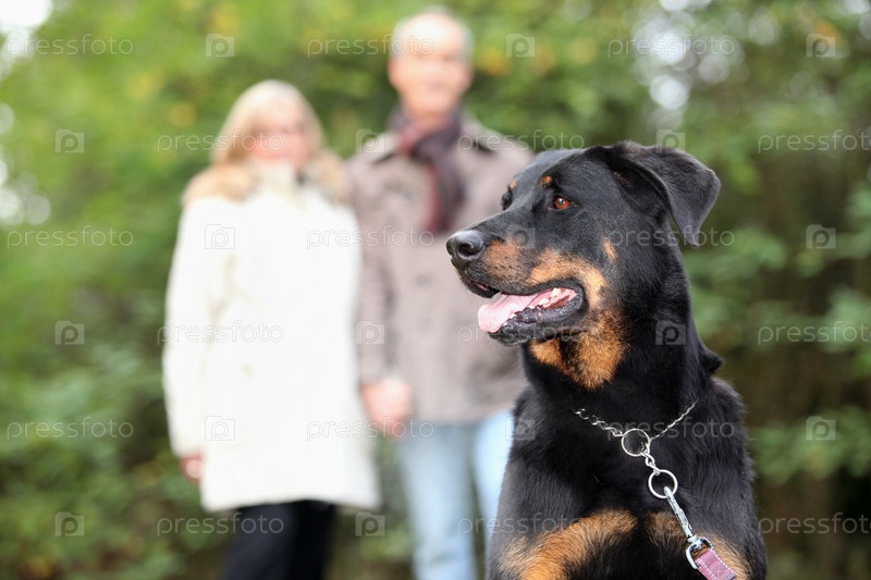 Пожилая пара гуляет с собакой