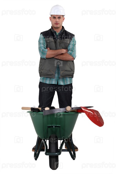 Ремесленник с тачкой, полной инструментов