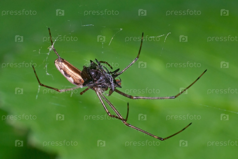 Паук Tetragnatha sp. ест муху