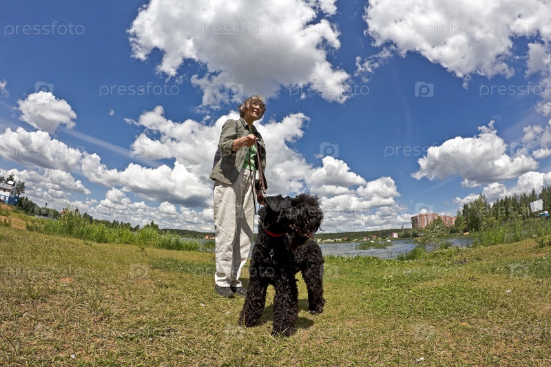 Пожилая женщина со щенком керри-блю-терьера. Фишай