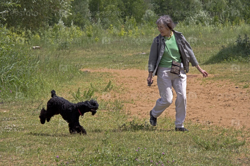Пожилая женщина гуляет со щенком керри-блю-терьера на природе