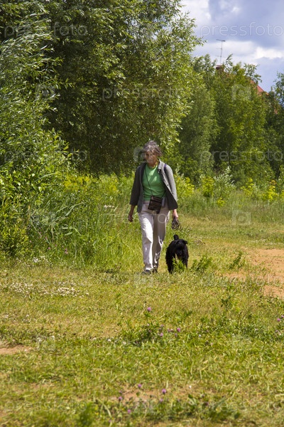 Пожилая женщина гуляет со щенком керри-блю-терьера на природе