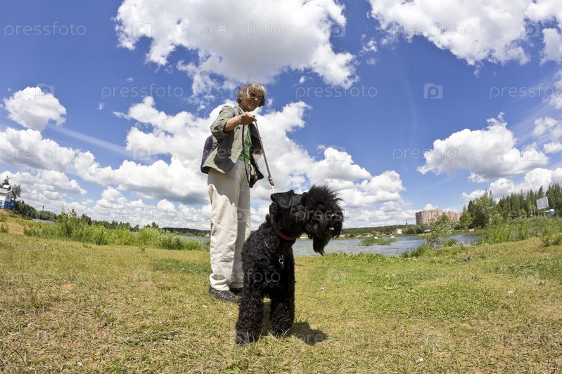 Пожилая женщина со щенком керри-блю-терьера. Фишай