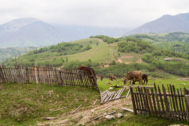 Коровы пасутся на зеленых горах