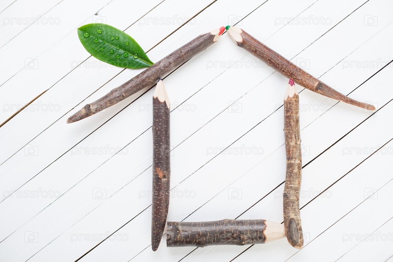 Символ дома из деревянных карандашей и зеленых листьев