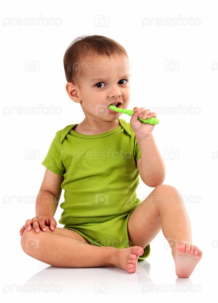 Милый маленький мальчик чистит зубы, изолированный на белом