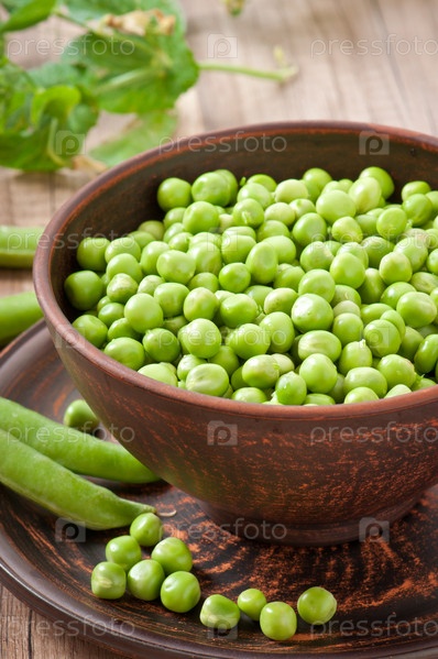 Зеленый горошек в керамической миске на старом деревянном фоне