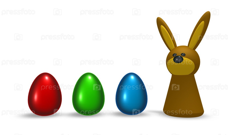 Кролик и пасхальные яйца на белом фоне - 3d иллюстрация