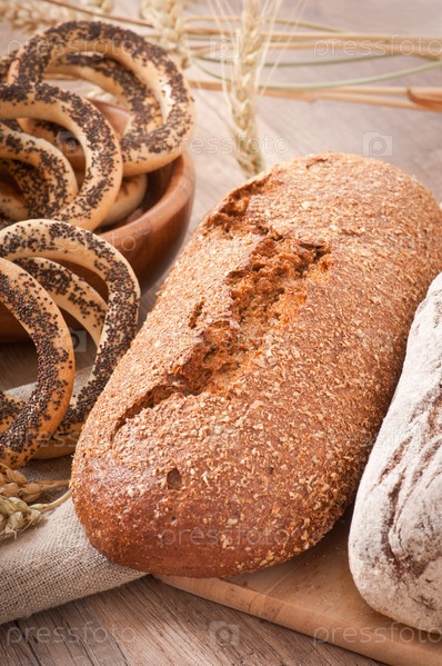 Хлеб и колосья на деревянном фоне