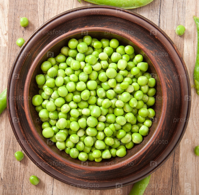 Зеленый горошек в керамической миске на старом деревянном фоне