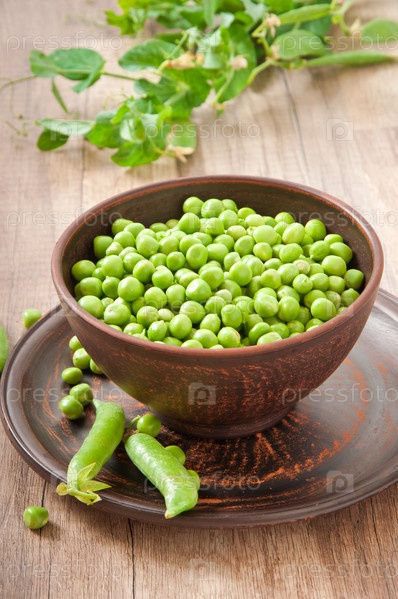 Зеленый горошек в керамической миске на старом деревянном фоне