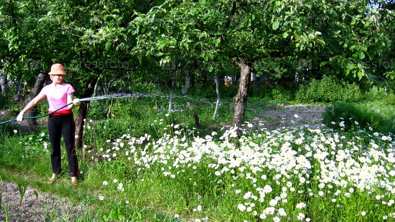 Девушка поливает огород