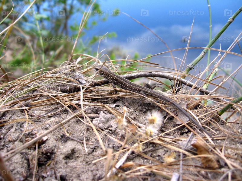 Серая ящерица на берегу реки