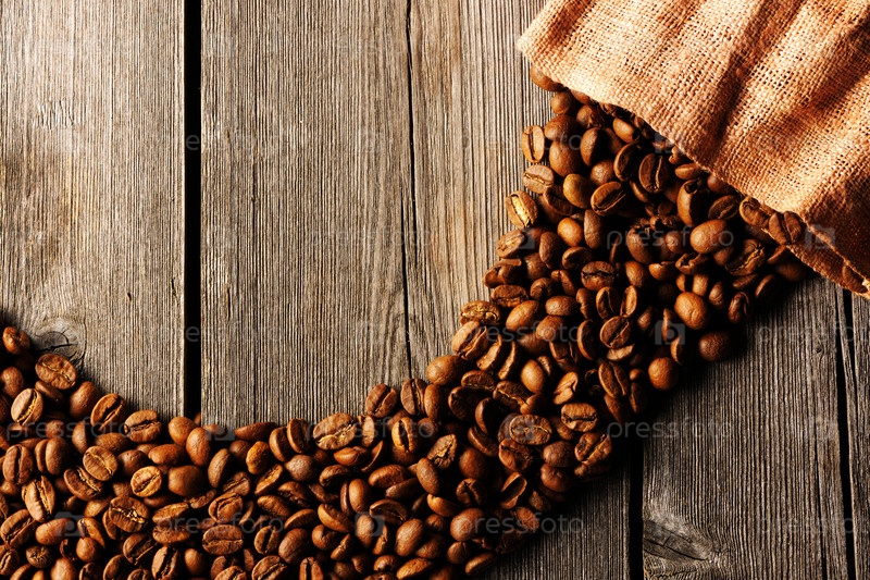 Кофе в зернах и мешок, фон
