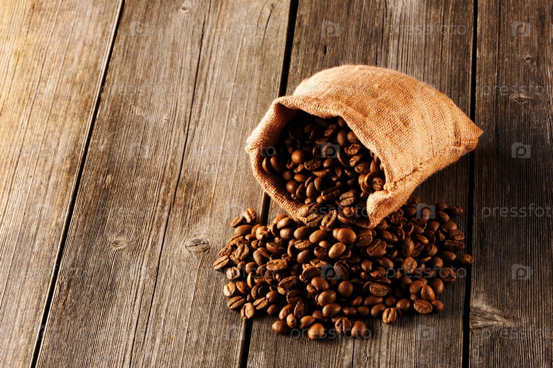 Кофе в зернах в мешке на столе