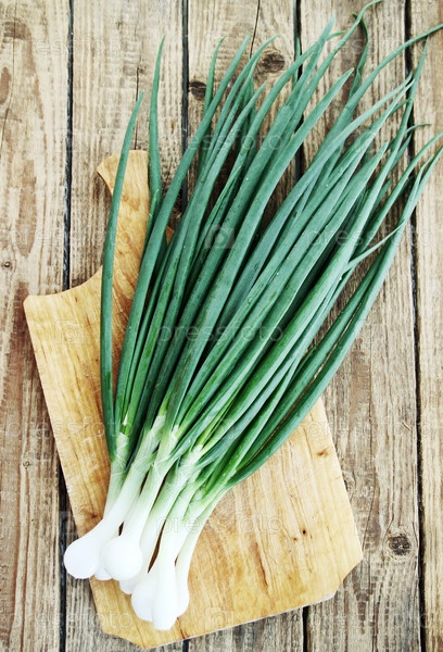 Молодой зеленый лук на деревянной доске