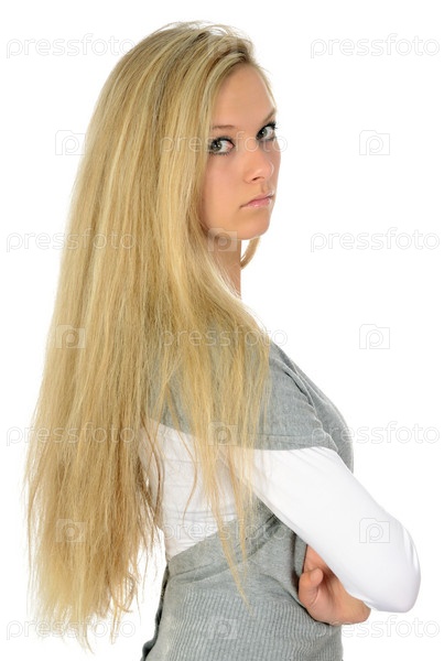 Серьезные блондинка на белом фоне